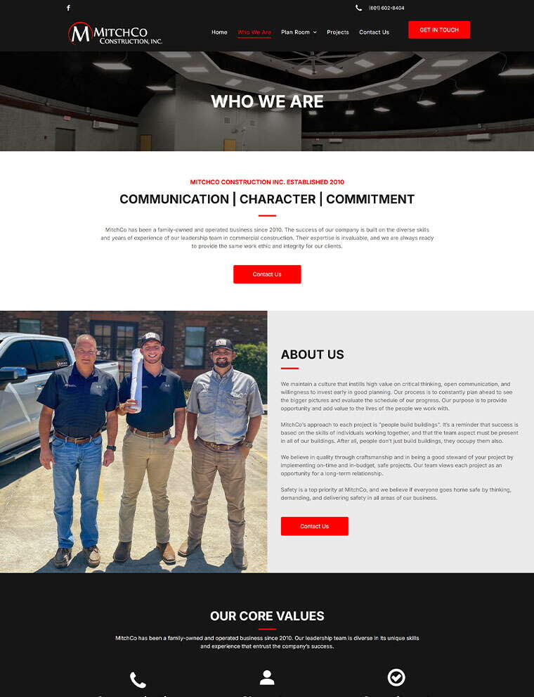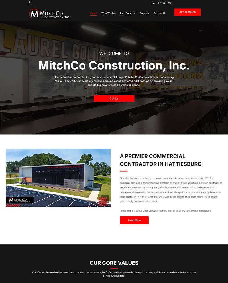 We built a clean, professional website for Mitch Co Construction, a growing general contractor establishing its place among seasoned competitors in the Hattiesburg market. The new site captures the company’s modern brand and showcases their craftsmanship through powerful photography and video, allowing their work to speak for itself. Designed with SEO-focused structure and optimized content, the site ranks prominently in local search without ongoing SEO. We also developed a secure, easy-to-manage Plan Room where Mitch Co can post new projects and accept contractor bids — a feature that saves hours of communication and keeps projects moving efficiently. The result is a professional, growth-ready platform that elevates Mitch Co’s brand, streamlines operations, and positions them as a trusted leader in South Mississippi construction.