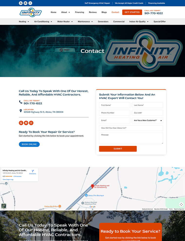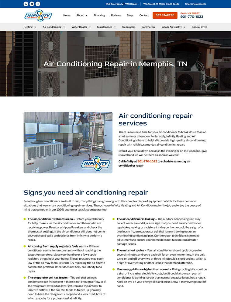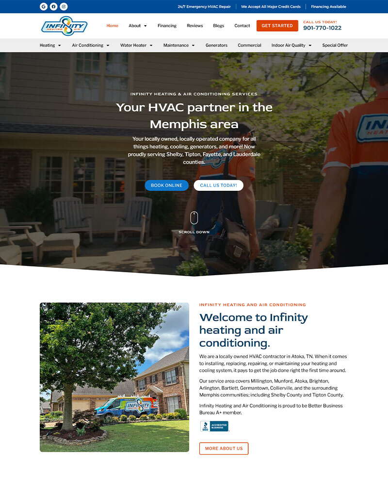 We rebuilt the Infinity Heating & Air website to match their new brand identity and drive stronger search visibility. The new site combines a clean, modern look with a conversion-focused structure built for SEO — helping Infinity rank higher, load faster, and turn visitors into service calls. With clear service pages, trust-driven design, and optimized content, the site positions Infinity as the top HVAC choice for homeowners and businesses across Memphis and beyond.