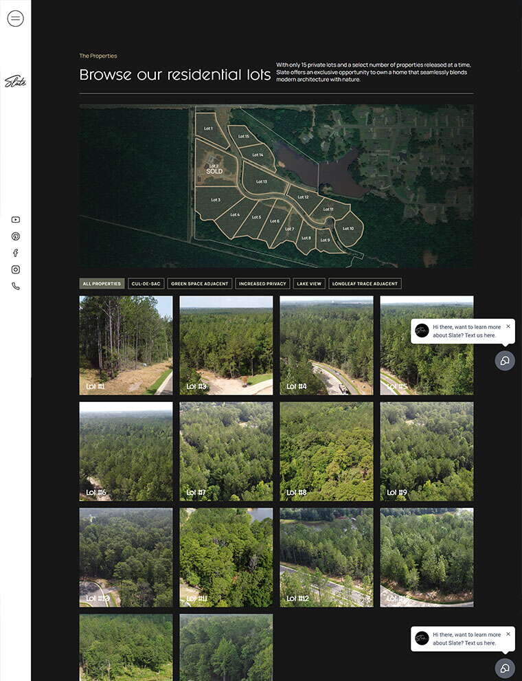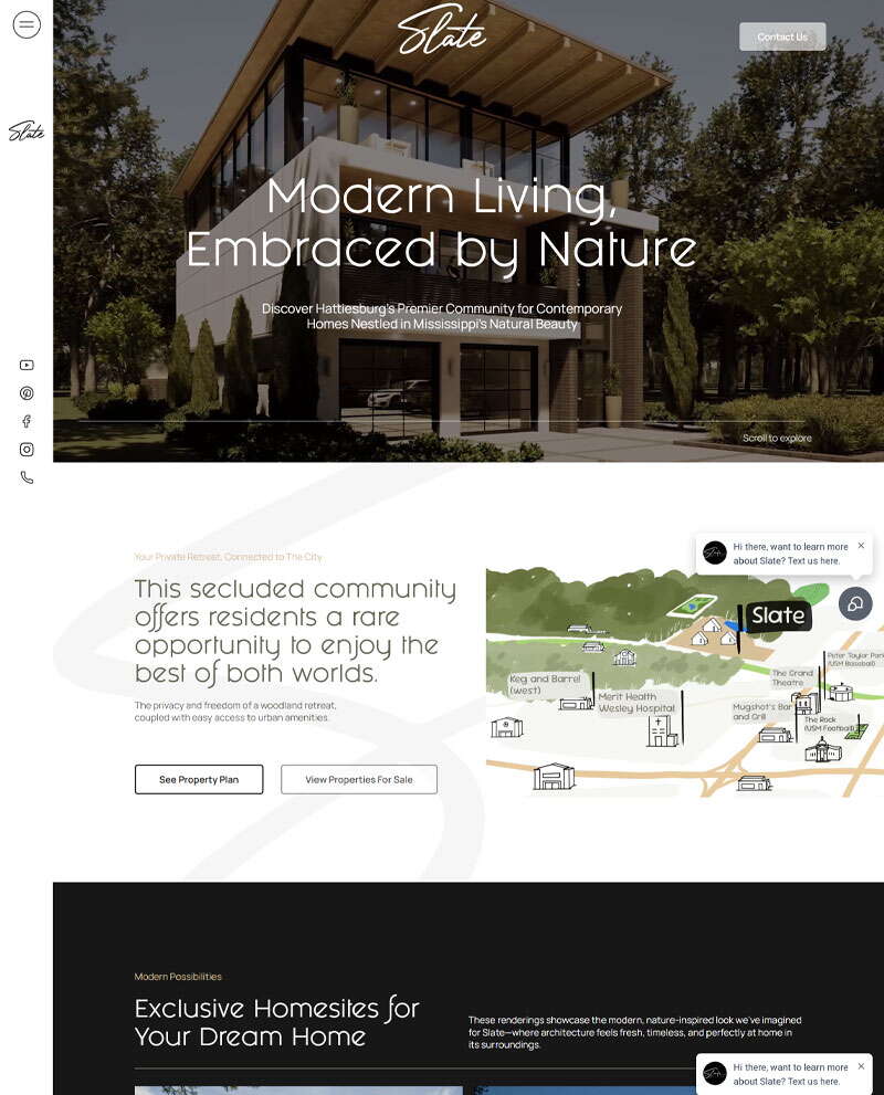 We built a high-end, design-focused website for Slate Development, a modern neighborhood redefining upscale living in Hattiesburg, Mississippi. With few existing assets, our team transformed the developer’s vision into a fully realized digital brand — complete with a custom logo, cohesive brand kit, and elegant, minimalist aesthetic. The site showcases Slate’s emphasis on green space, architectural harmony, and modern design through immersive visuals, property walkthrough videos, and an interactive lot grid built from aerial imagery. Supported by SEO-optimized copy targeting homebuyers seeking modern living in South Mississippi, the site positions Slate Development as the premier destination for those who value sophistication, space, and intentional community design.